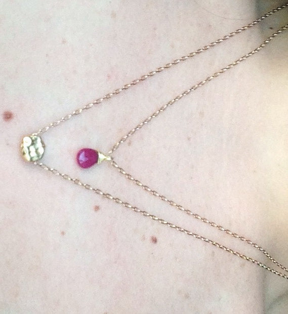 This necklace is made with a teeny-tiny teardrop shaped Genuine RUBY (w wire-wrapping on the top) on a gold-filled chain