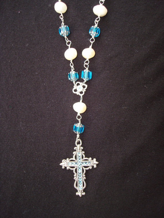 This delicate, light blue, cross necklace has the perfect pairing of pearls and crystals to add elegance and class to any outfit!