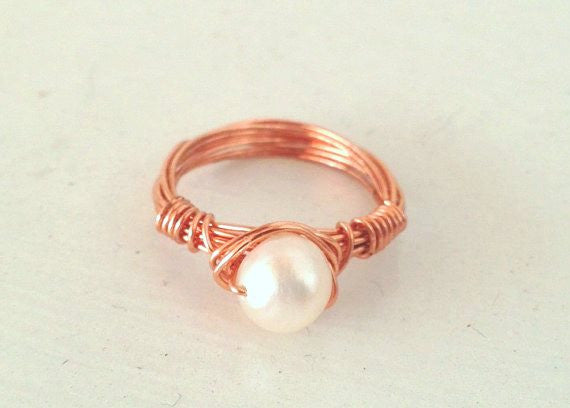 This ring is made of thin rose gold (plated) wiring and a freshwater pearl. We use a non-tarnish German Style wire in 24 gauge.