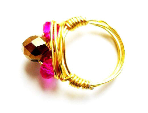 This ring is made of one bronze crystal bead and two smaller magenta pink crystal beads (these pictures don't do the color justice). We use a non-tarnish German Style wire in 24 gauge.